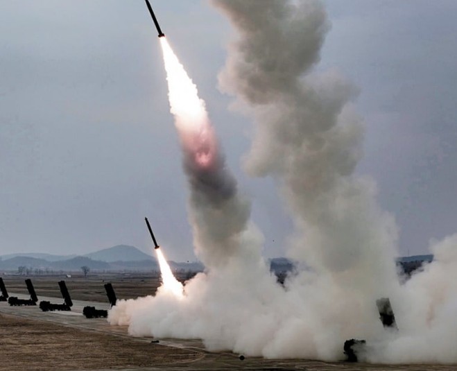 但尽管特朗普表明对话意愿,朝鲜刚过一天却以武力示威作为回应。据韩国联合参谋本部称,14日下午1点20分左右,朝鲜从平壤顺安一带向东海海上发射了10余枚弹道导弹。韩美情报当局推测,大概率是可以搭载战术核弹头的对韩打击用武器——600毫米超大型火箭炮(KN-25)。而且一次性发射10余枚被指为罕见之举。